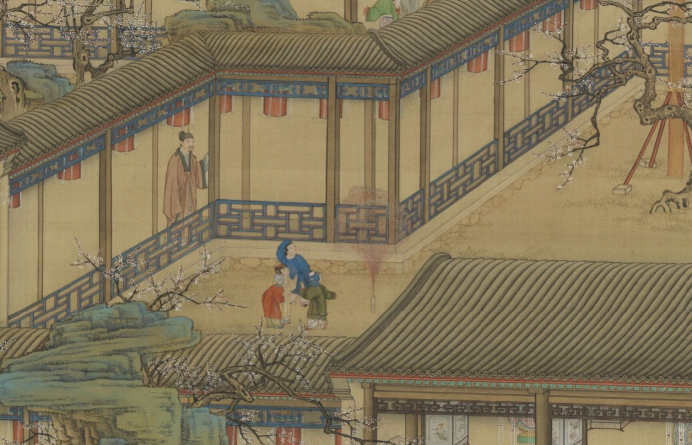 清 丁观鹏《绘高宗御题范成大爆竹行轴》局部,台北“故宫博物院”藏