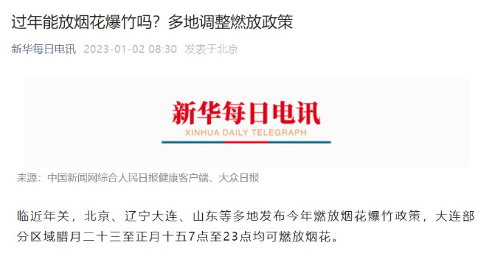 媒体关于部分地区可在规定时间燃放烟花的报道