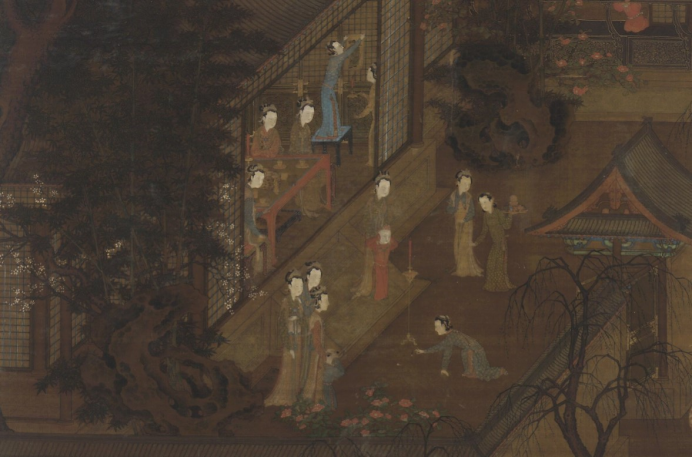 北宋 佚名《岁朝图》局部,弗利尔美术馆藏,图中趴在地上的女子正小心翼翼地点燃爆竹